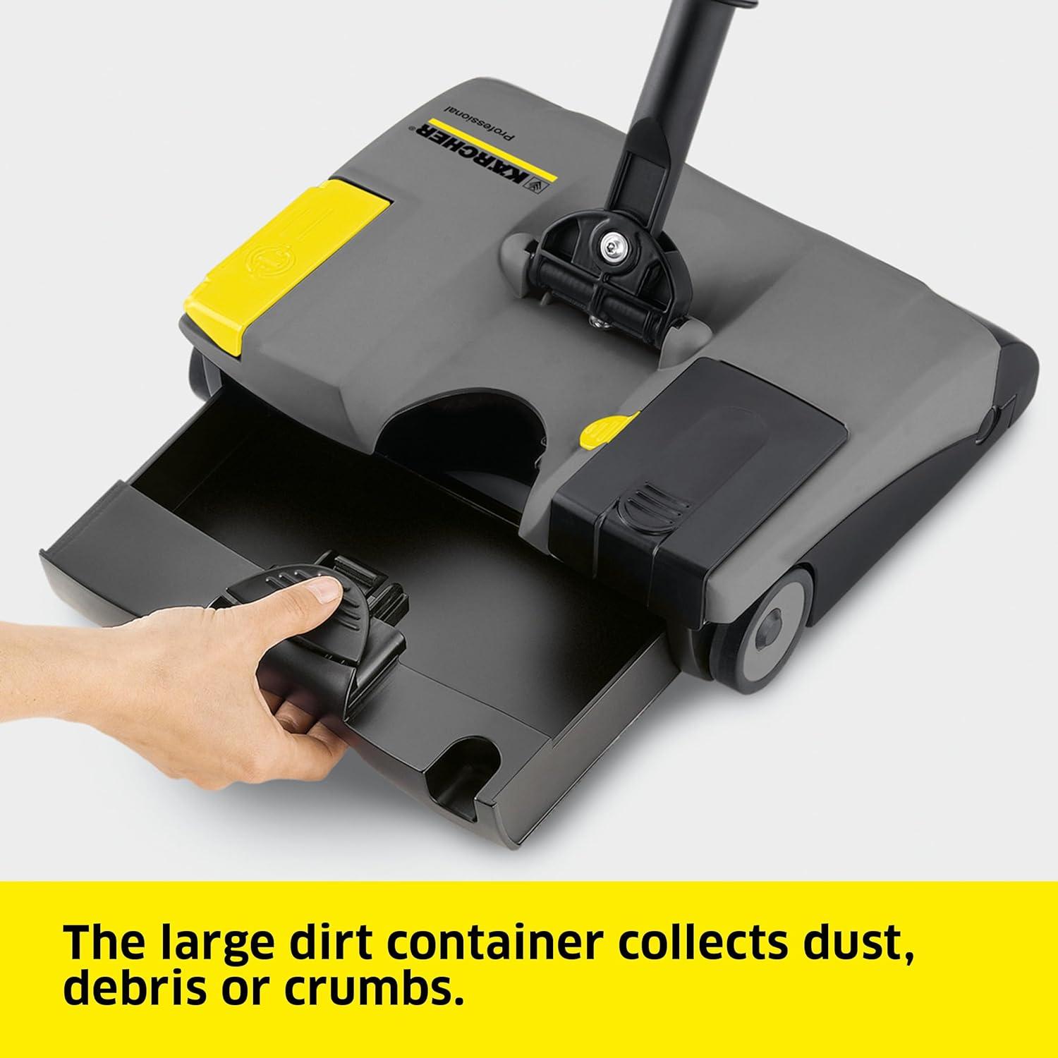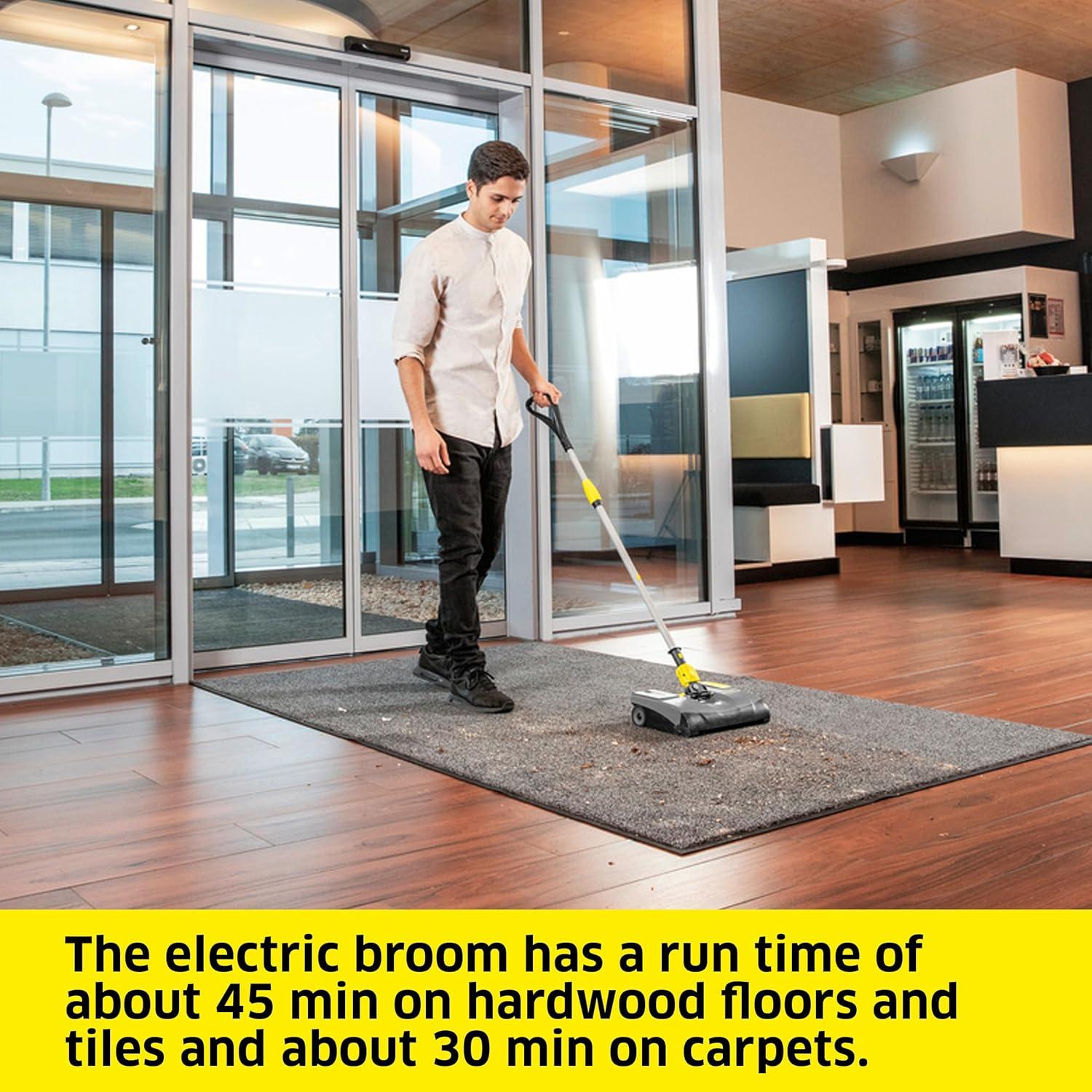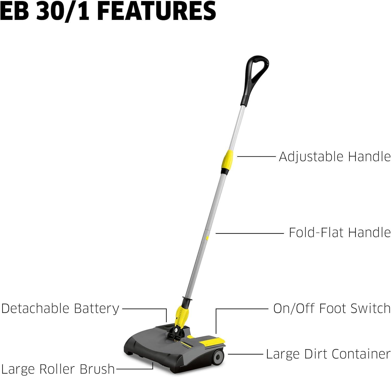 The EB 30/1 has a foot-operated on/off switch. At 90 mm tall, the unit is flat enough to reach beneath radiators and furniture with low ground clearance. It picks up loose dirt within just 2 mm of its edges. The telescopic broomstick has a push handle and can be adjusted to suit the operator’s height, while a universal joint enables it to move in all directions. When not in use, it locks into the vertical position. The electric broom can run for roughly 30 minutes on carpets and 45 minutes on hard floors before the powerful nickel cadmium battery requires recharging. Charging time can be reduced from 12 hours to 50 minutes using the optional fast charger. Batteries can be swapped to permit uninterrupted working. No tools are required to change batteries or remove the roller brush. Any fibers that get wound around the brush can be removed by running a knife along a specially designed groove to sever them.