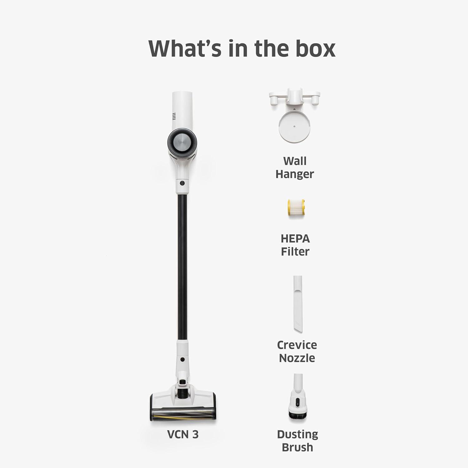 What's Included: VCN 5 Stick Vacuum, Wall Hanger with Accessory Ports, HEPA Filter, Multi-Purpose Rollerbrush, Hard Floor Rollerbrush, Crevice Nozzle, 2-in-1 Dusting Brush, Upholstery Nozzle, Flexible Hose, Pet Fur Upholstery Tool, Pet Grooming Brush, Battery, Charger
