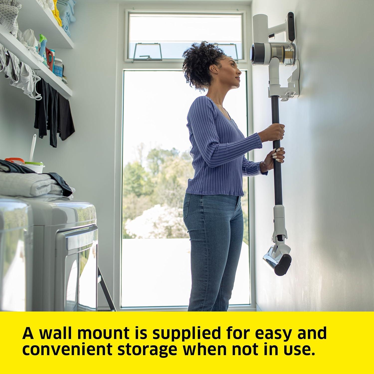 The Kärcher VCN 5 Cordless vacuum cleaner allows freedom of movement with maximum comfort and minimal effort. A run-time of up to 71 minutes in Eco mode provides uninterrupted cleaning while features such as boost mode make vacuuming easier. The 550 watt motor, HEPA H13 Filter, and bagless filter system provide energy efficient use while the LED screen shows the mode and battery life remaining. With an easy empty dust bin, it is perfect for cleaning jobs around the home. The power trigger removes the need to constantly hold down the power button when in use while the motor allows 3 stages of cleaning power: Eco, Mid, Turbo. With a long shaft and layflat design, it can easily navigate around furniture as well as reach under the sofa. Two rollers are included. The universal floor roller allows for seamless transition across multiple flooring types while the hardfloor cleaner offers additional cleaning on flat flooring types. The VCN 5 Cordless is the pet friendly choice with a Pet Brush and a Pet Upholstry attachment. Additional accessories include an upholstry roller head, a crevice nozzle, a 2-in-1 dusting brush, and a flexible hose to address the toughest cleaning applications in your home. A wall mount is also included for easy and convenient storage when not in use.