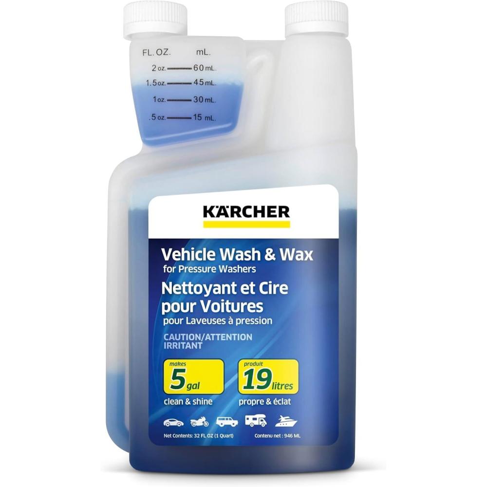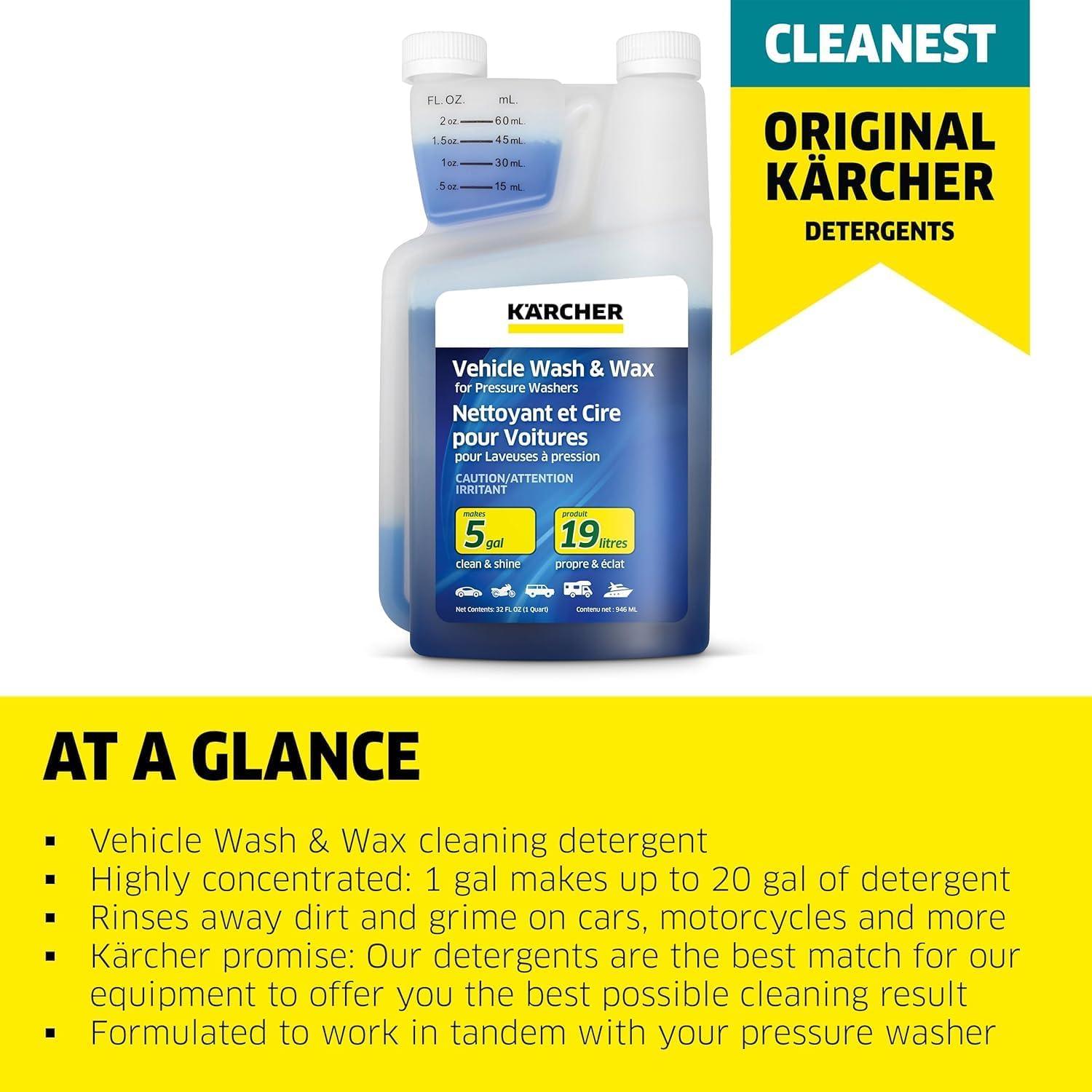 Highly Concentrated: Make up to 5 gallons of detergent from a single quart of Karcher's Vehicle Wash & Wax Concentrate