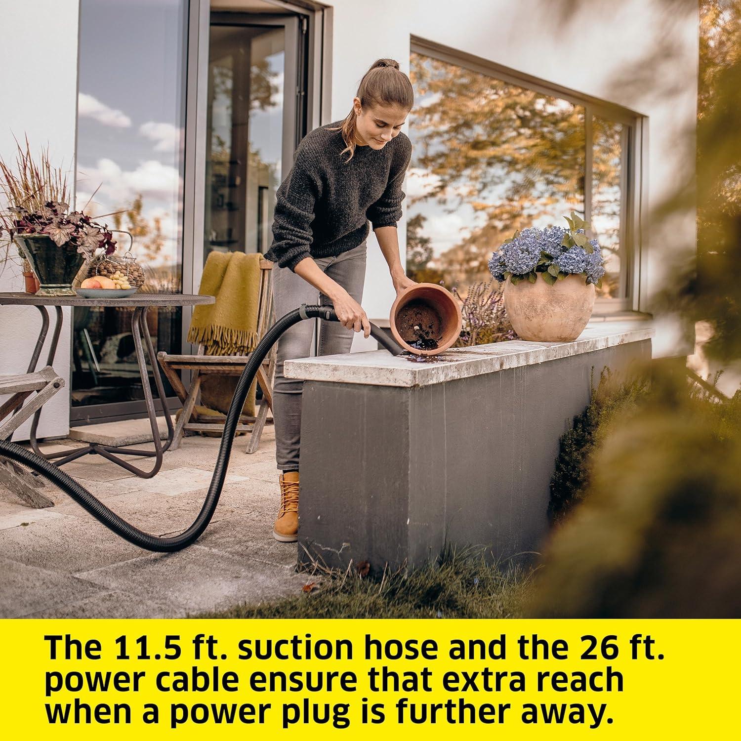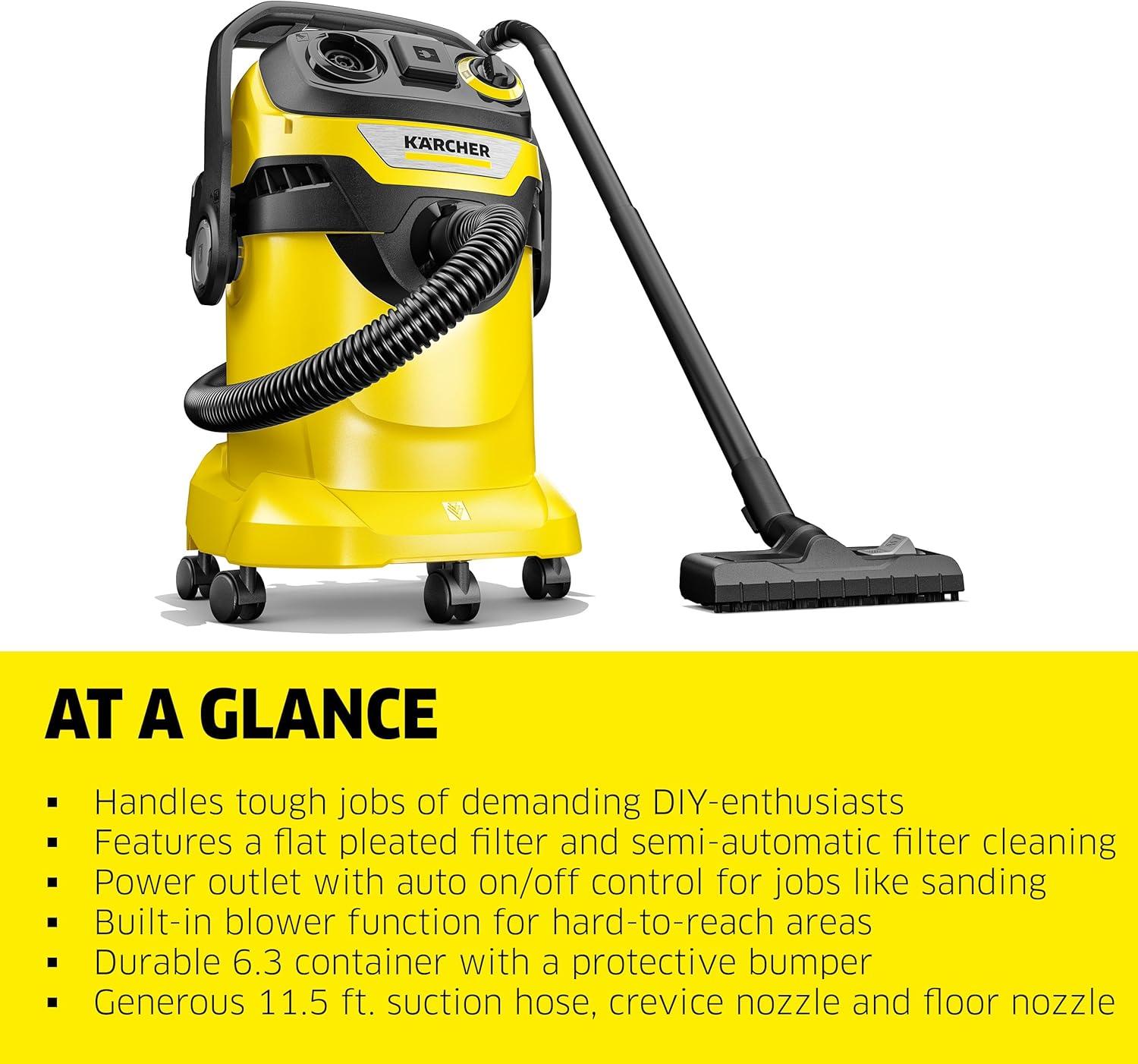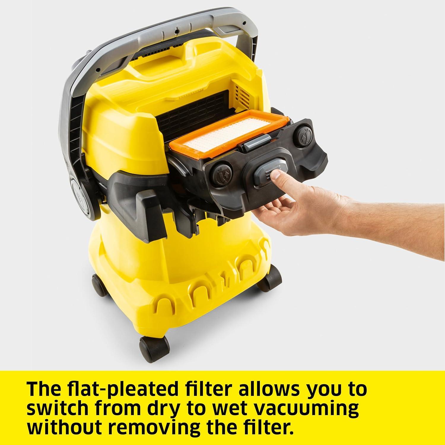 The WD 3 Vacuum Cleaner is a powerful shop vac designed for optimal cleaning results on dry, wet, fine, or coarse dirt, this machine is equipped with a perfectly matched suction hose and interchangeable wet/dry floor nozzle. Impressing with its compact design and robust 4.5-gallon highly durable polypropylene T20 container, the WD 3 is built to last. The top-mounted cartridge filter allows for vacuuming both wet and dry without the hassle of removing the filter. Its blower function is especially useful for cleaning hard-to-access areas, eliminating the need for an additional tool. For convenient storage, the hose can be hung on the machine head, saving space. The cable can be neatly stored on the cable hook, while the tubes and floor nozzles can be kept at the bumper. The container features a “”Pull & Push”” locking system, enabling easy opening and closing. The vacuum cleaner handle can be removed, allowing direct connection of accessories to the suction hose. With its ergonomically shaped carrying handle, comfortable transport is ensured. The WD 3 Vacuum Cleaner is the perfect choice for car cleaning enthusiasts. With its compact design and powerful suction, it is specifically designed to tackle the unique challenges of cleaning your car's interior. The included crevice nozzle reaches into tight spaces between seats and consoles, while the floor nozzle can be used to easily clean the trunk. The WD 3 Vacuum Cleaner includes a 7.5 ft. suction hose, (2x) 1.8 ft. suction tubes, a hand nozzle, a crevice nozzle, a wet/dry floor nozzle, a single-piece cartridge filter, and a fleece filter bag. It's a complete package for all your cleaning needs. Experience the power, versatility, and durability of the WD 3 Vacuum Cleaner. Whether you need a heavy-duty vacuum cleaner or an outdoor vacuum for your patio, this reliable machine is up to the task.
